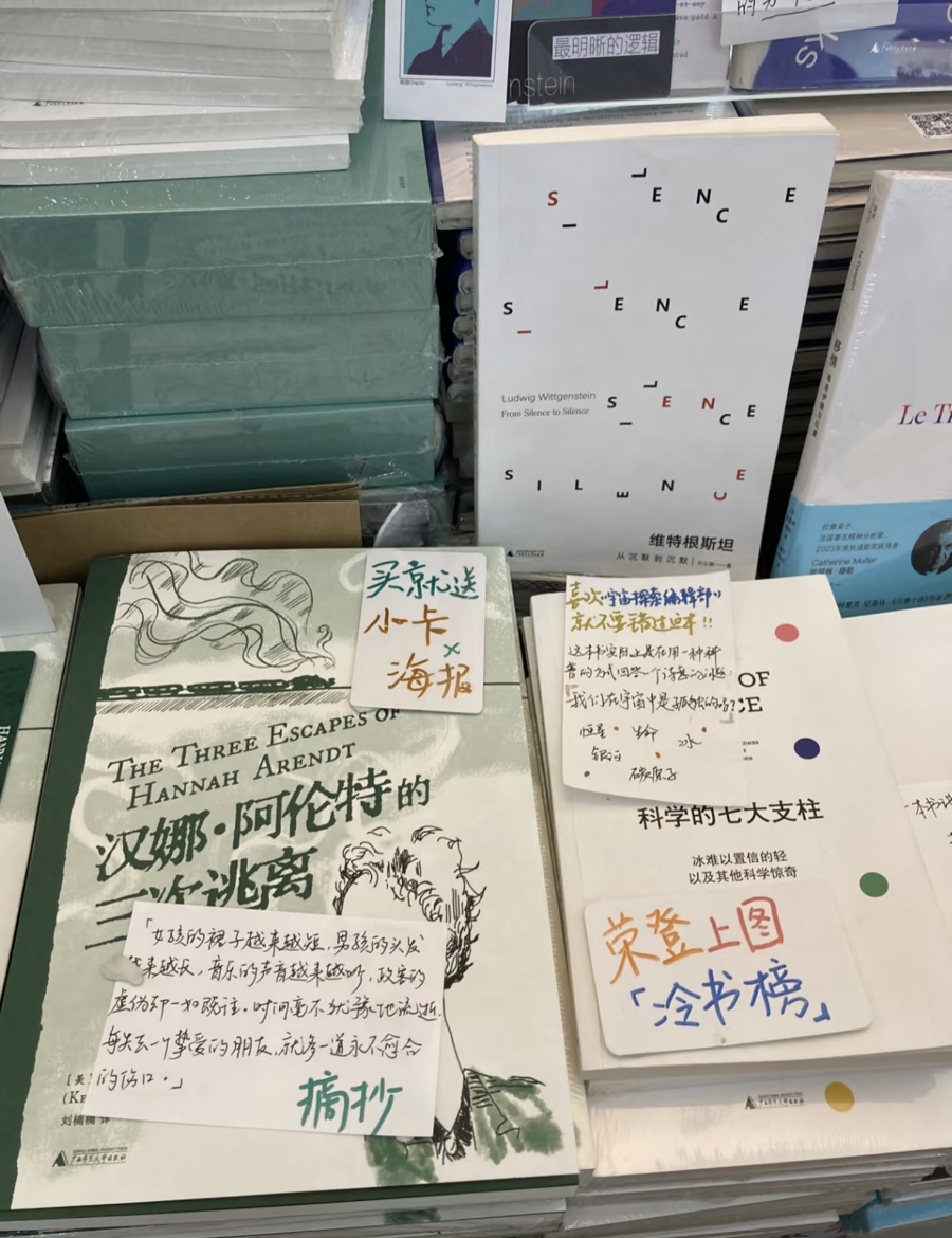 广西师大出版社展位上,《汉娜·阿伦特的三次逃离》的书封上,贴着编辑手写的语句摘抄:“女孩的裙子越来越短,男孩的头发越来越长,音乐的声音越来越吵……时间毫不犹豫地流逝,每失去一个挚爱的朋友,就多一道永不愈合的伤口。”这本书在闭幕前一天就已经售罄,观众“鹪鹩”在社交平台与编辑“偶遇”,激动地表示,正是因为看到了手写卡,才入手了这本书。